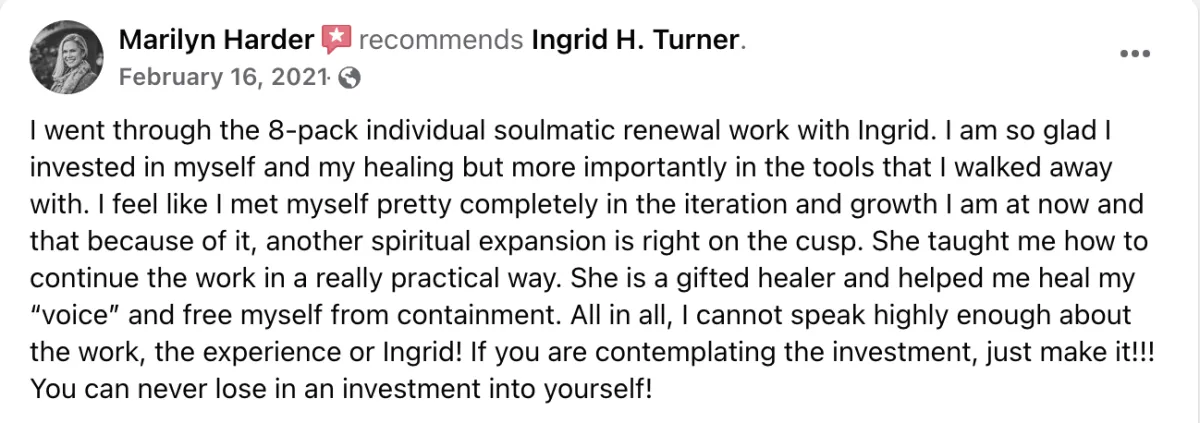 Inside Be Soul Confident, I’ll coach you through my proprietary healing method, Soulmatic Renewal™ — a transformational process that’s helped dozens of my clients break through imposter syndrome, ditch self-doubt, and finally act on the life they’re here to live.